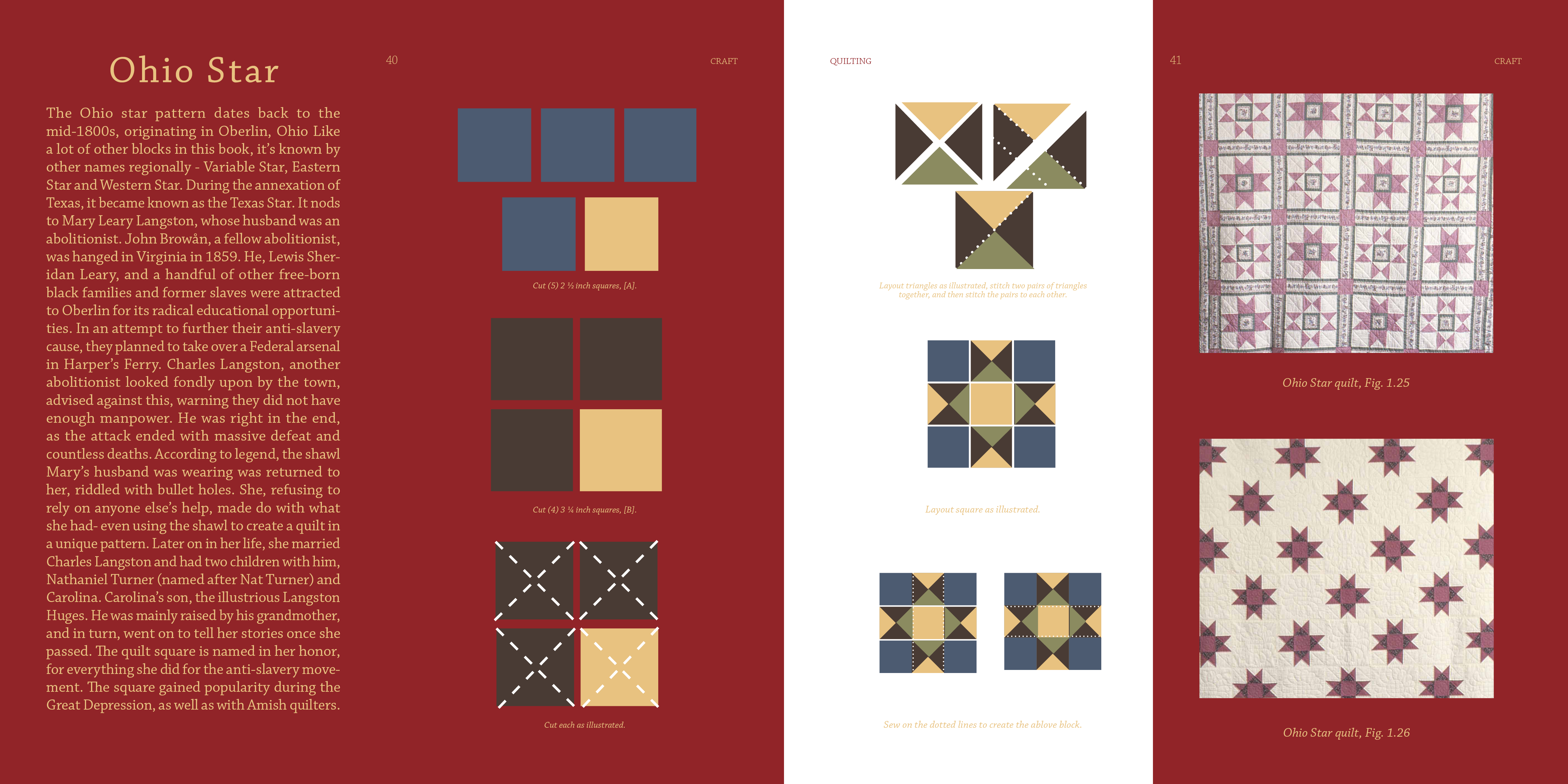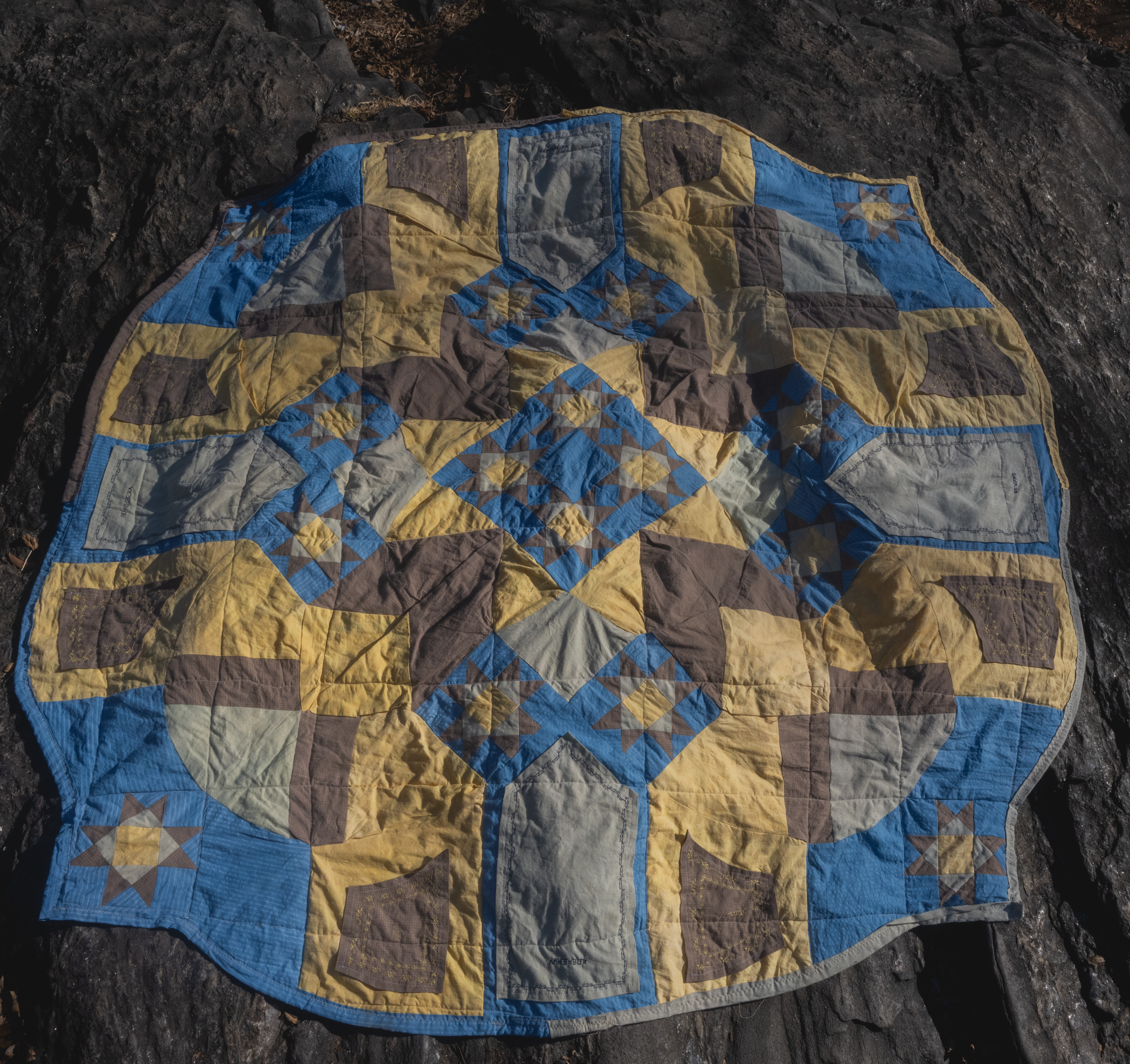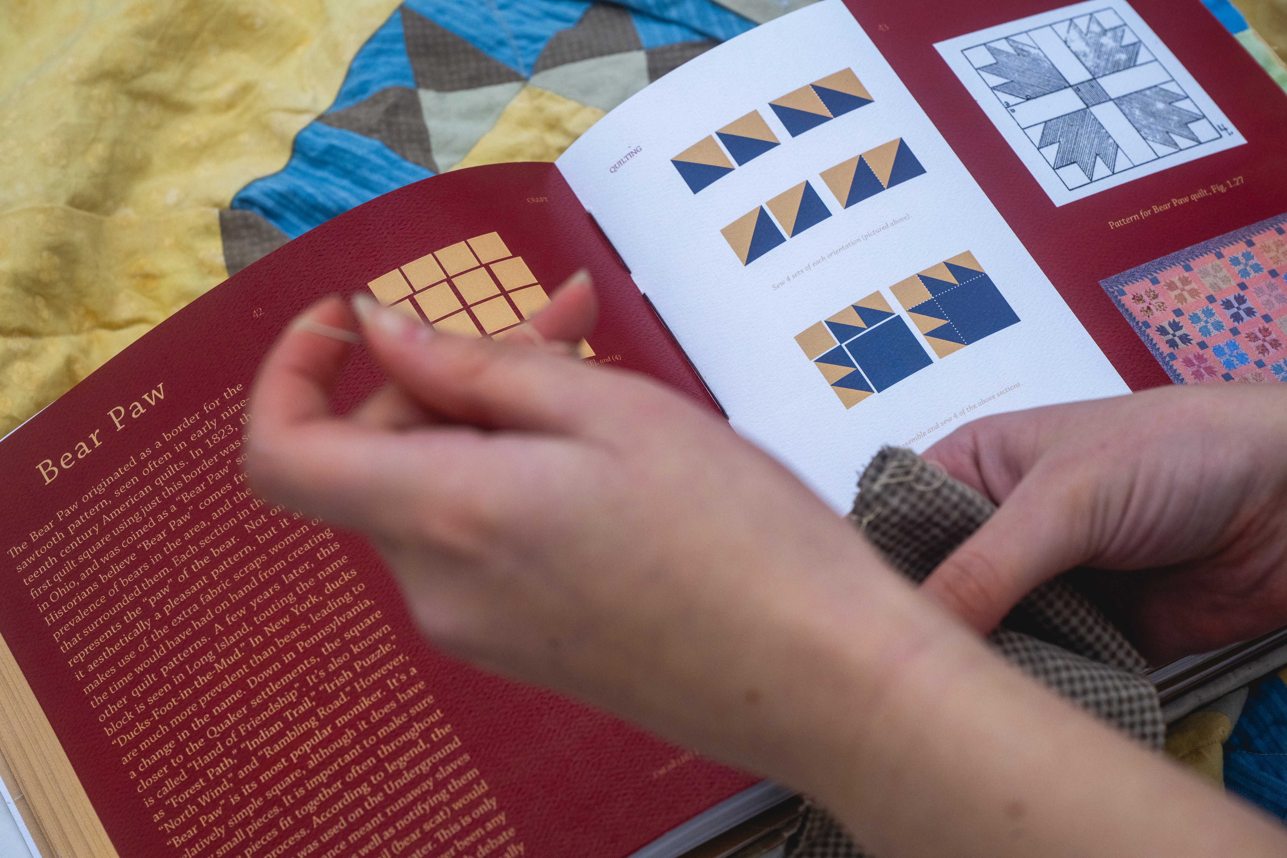 itself, using natural dyes, traditional quilt blocks, sourced fabrics, and